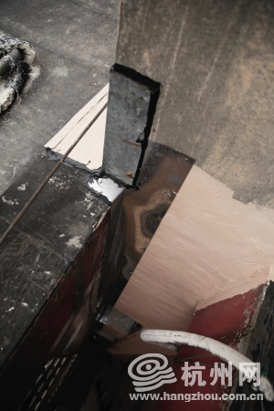 周師傅說,加固是3月5日開始的,在兩幢房子的連接處。工人將縫隙擴大,然后塞進入泡沫一樣的東西,外面再用鐵皮固定住。這樣,兩幢房子沒有直接連在一起,就算1、2單元的房子略微傾斜,也不會影響到3單元房屋的安全了。