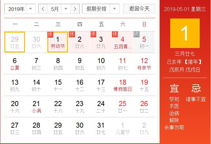 2019年05月1日—2019年05月4日,共計四天;2019年5月5日(周日)正常上班。