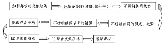 不銹鋼絞線網通過粘合強度及彎曲強度高的滲透性聚合物砂漿附著,與原來的混凝土形成一體。不銹鋼絞線網加上滲透性聚合物砂漿使結構的承載力得到提高,同時也增加了結構的剛性。滲透性聚合物砂漿使原結構混凝土界面剝離、脫落部位進行了修復,使它們重新粘結成為一個整體,可以防止結構耐久性的降低,能夠解決新老界面粘結的問題。